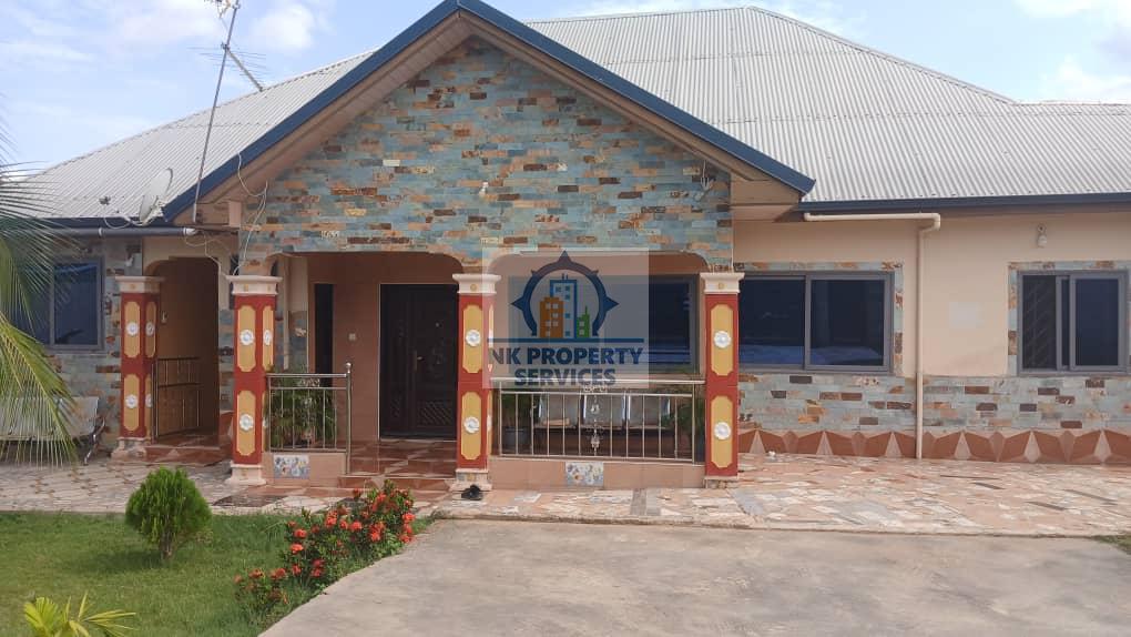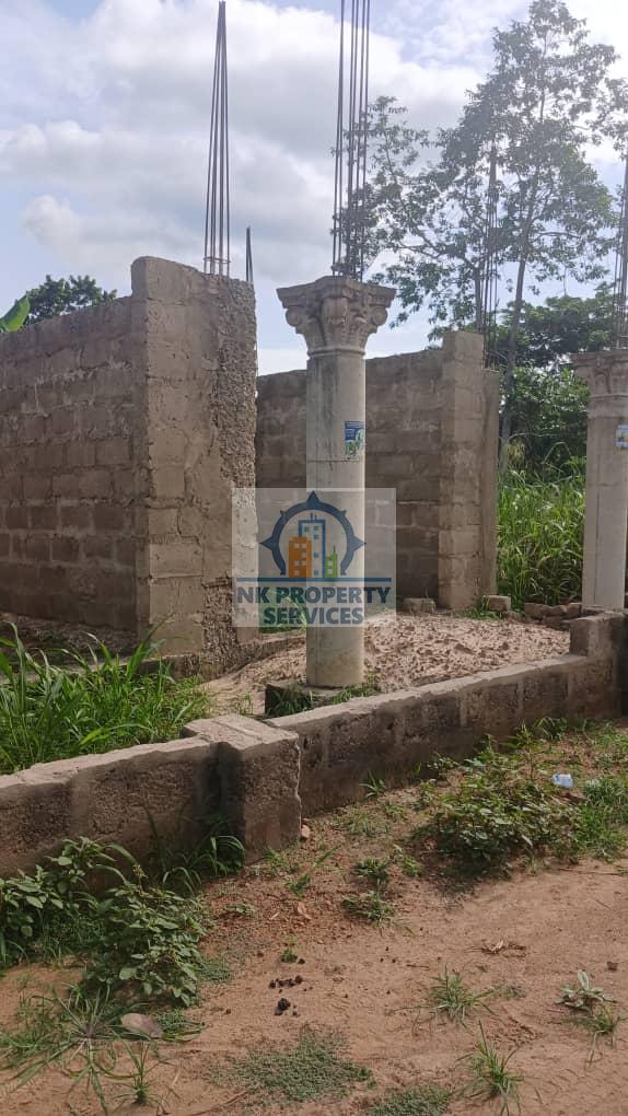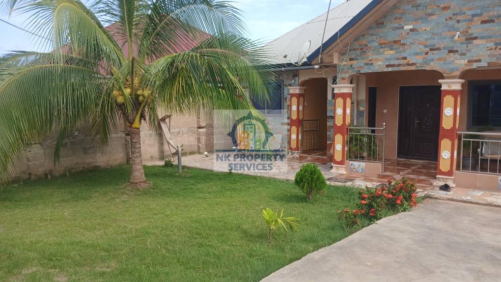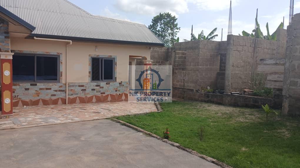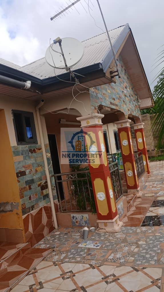 Three bedrooms house for sale at Koforidua .2 master bedrooms and 1 bedroom Living area Dining Kitchen Store room Guest washroom One chamber and hall self contain Mechanised water system Walled and gated 24/7 CCTV Spacious compound Land registered 3 uncompleted chamber and hall self contained storey with 3 shops/ stores